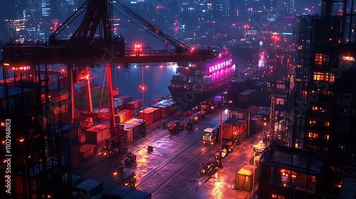 Aerial shot of a crane truck loading a container onto a large cargo ship, full view of the bustling port, numerous containers, dock workers, vibrant lighting, dynamic perspective, intricate details,