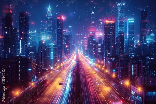 Aerial view of a city at night with a highway network and traffic lights. Concept for urban development, transport system or business center plan. Blurred motion. Abstract background