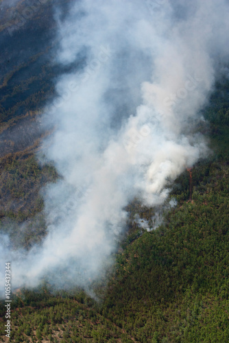 Aerial view of a forest fire with smoke rising and green vegetation, Buryat Republic, Russia.