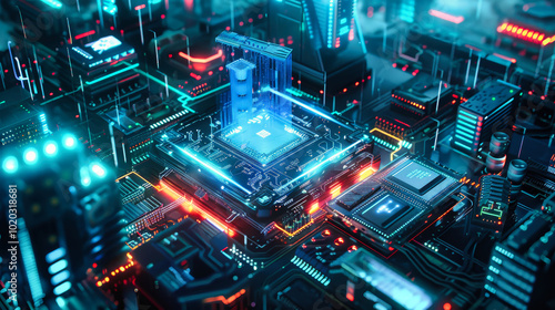 Aerial view of a futuristic AI chip with a holographic interface amongst advanced circuits and buildings illuminated by dynamic lighting at dusk