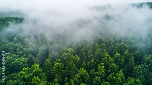 aerial view of a misty forest landscape with dense green trees and foggy clouds