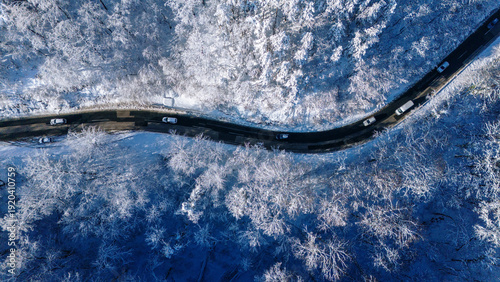 Aerial view of a winding road cutting through a snow-laden forest, vehicles navigating the path amidst the stark contrast of dark asphalt and pristine white trees, Novi Sad, Vojvodina, Serbia.
