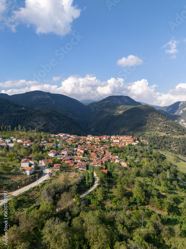 Aerial view of Gelemiç village nestled in a green valley in Bursa, Turkey. Surrounded by forested mountains under a clear blue sky, the village features red-roofed houses and lush vegetation
