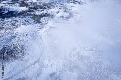 Aerial view of winding road on snowy mountain with fog The concept of winter travel