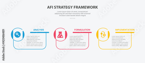 AFI strategy framework infographic outline style with 3 point template with creative box container with circle icon on edge for slide presentation