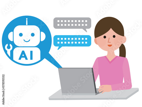 AI チャットボットとパソコンでチャットする女性 イラスト