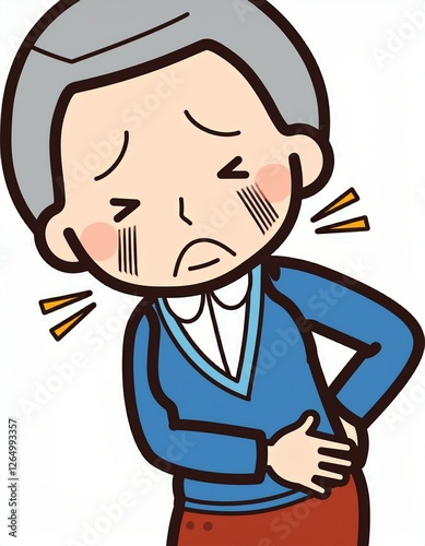 手を腰に当てる、腰が痛いおばあさんのイラスト。AIで生成