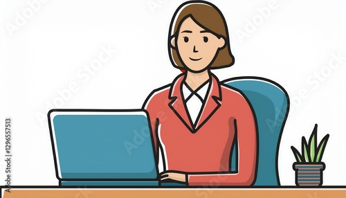 パソコンで作業をする女性会社員のイラスト。AIで生成