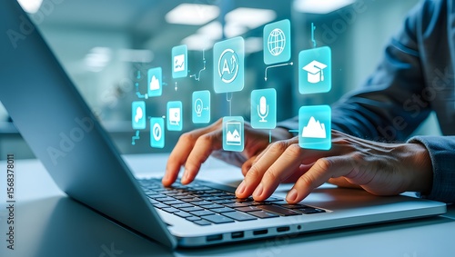 AI Artificial Intelligence technology for education. Modern digital learning, courses for developing new skills and e-learning. Man learning lessons and online seminars on laptop.
