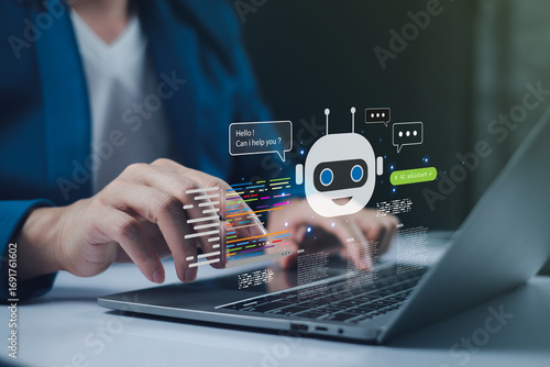AI assistant, chatbot, artificial intelligence, automation, and coding concept with virtual robot interface on laptop used by a man working in digital communication.