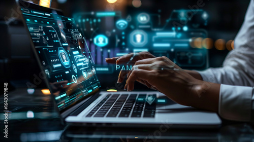 AI automation and API automation. Data transfer through system integration. Intelligent process automation technology solutions. Businessman using laptop computer for managing automation technology