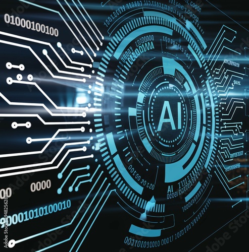 AI Circuitry: A futuristic visualization of AI's intricate workings, with glowing circuitry and binary code converging on a central AI icon, symbolizing the power and complexity of artificial intellig