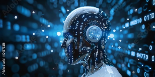 AI concept, head robot, binary numbers in background