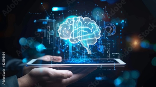 AI, data science, digital technology concept. Computer programmer using digital tablet with AI machine learning, data management system, cloud computing technology, software development
