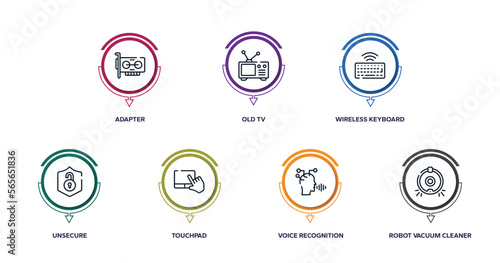 ai for earth outline icons with infographic template. thin line icons such as adapter, old tv, wireless keyboard, unsecure, touchpad, voice recognition, robot vacuum cleaner vector.