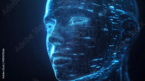 ai game developer materializes as digital 3d head futuristic design elements form facial features code streams and neural networks visualize artificial intelligence at work