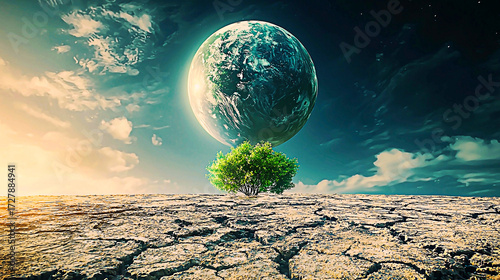 AI Generated - Lone tree standing in the middle of a desert, with a planet in the sky above it. Professional stock photography for commercial use. High-resolution. Premium quality. Professional grade.