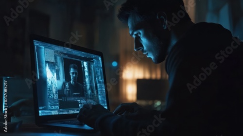AI image creation technology. Man use AI software on a laptop to generate images, showcasing a futuristic user interface. screen with visual prompt. Image generated by artificial intelligence. photo,