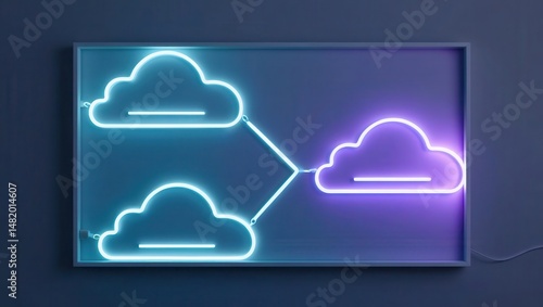 AI learning tools virtual classroom concept. Neon lights form three connected cloud icons on a dark wall, symbolizing cloud computing and data transfer.