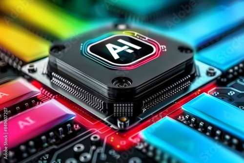 AI microchip on a colorful circuit board, representing advanced technology, data processing, and smart computing in modern digital environments.