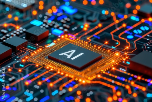 AI microchip on circuit board, high tech computer hardware, orange circuitry, futuristic electronics, digital processor illustration