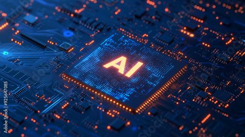 AI microprocessor on a blue circuit board with illuminated orange details.