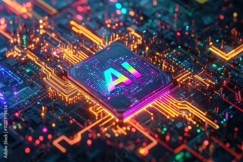 AI processor chip on a vibrant circuit board, surrounded by glowing neon lines and components, symbolizing advanced technology and artificial intelligence innovation