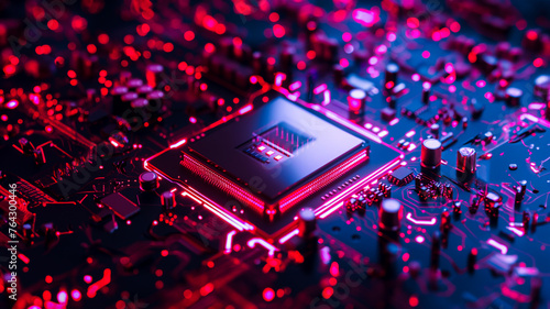 AI quantum processor on circuit board, abstract digital background of a network of digital circuits and connections.