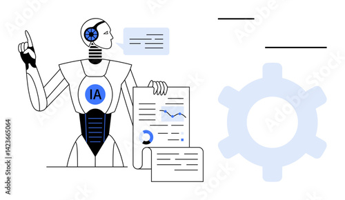 AI robot explaining analytical data using charts and documents. Ideal for innovation, technology, data analysis, automation, machine learning, future concepts, process improvement. Flat simple