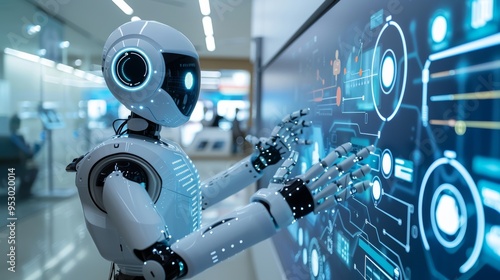 AI robot interacting with an interactive touchscreen display in a state-of-the-art office