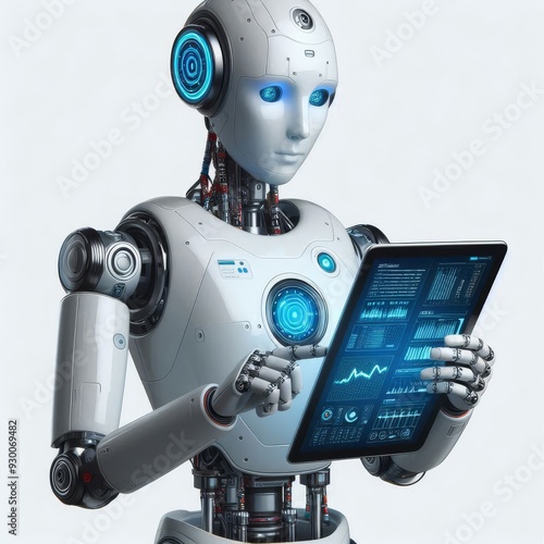 Futuristic AI Robot Interacting with Digital Tablet - Technology and Data