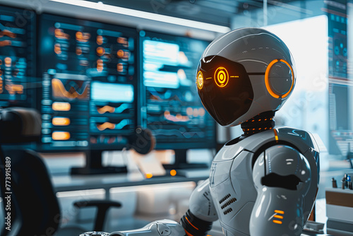 AI robots with screens displaying real time data analysis and learning big data in the world.