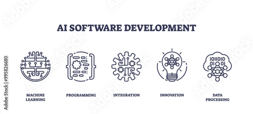 AI software development concept with machine learning, programming, and data processing outline icons set.