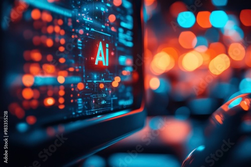 AI Symbol on a Computer Screen with Blurry Lights