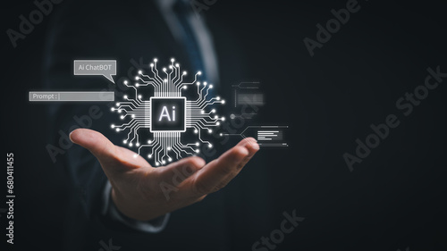 Ai tech, businessman show virtual graphic Global Internet connect Chatbot Chat with Artificial Intelligence. using command prompt for generates something, Futuristic technology transformation.