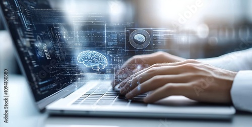 AI Technology for Business Data Analysis Programming and Machine Learning with Digital Brain on Laptop