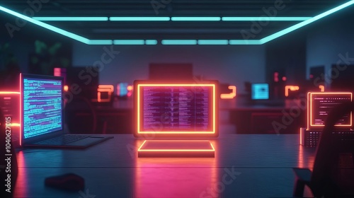 AI-powered algorithm coding lab, neon code blocks, futuristic office environment