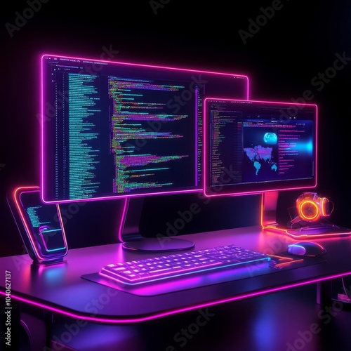 AI-powered coding tools, interactive code visualizer, futuristic workspace, neon accents