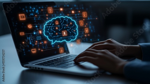 AI-Powered Connections, Laptop Displaying Neural Network and Digital Data Flow