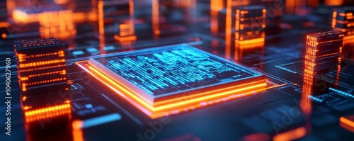 Algorithm simulation in hologram, glowing data blocks, futuristic office, tech lab