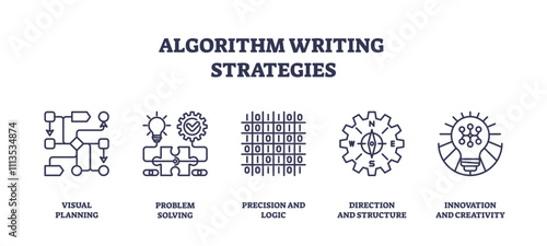 Algorithm writing strategies visualized with flowcharts, gears, and lightbulbs, transparent background. Outline icons set.