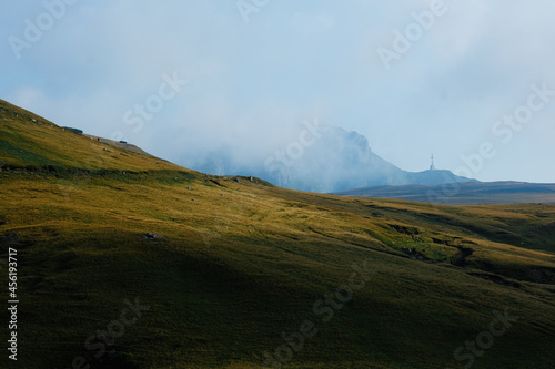 Amazing landscape on the Bucegi Plateau, the road from Piatra Arsa to Babele, Carpathian Mountains, Romania. Far away is Caraiman Heroes' Cross.