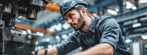 American Technician Adjusting Machinery Inside a Modern Factory Environment with a Focused Expression