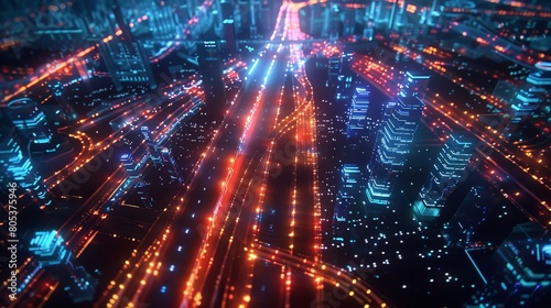 An abstract aerial view of a city at night with glowing lights representing data flowing through the streets.