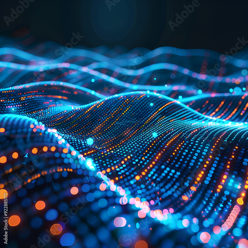 An abstract background with particles forming a digital matrix, resembling data streams and binary code in a futuristic, high-tech pattern.