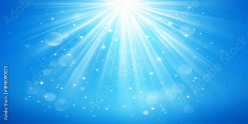 An abstract blue sky background features a bright sun burst with glowing rays and sparkling light beams across a vector space design