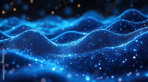 An abstract blue tech background with dynamic digital waves, network systems, artificial neural connections, and quantum computing elements.