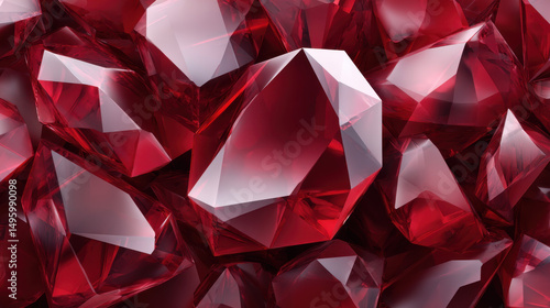 An abstract close-up shows a cluster of dazzlingly bright red ruby gemstones with facets and clear reflections, creating a luxurious texture and pattern effect.