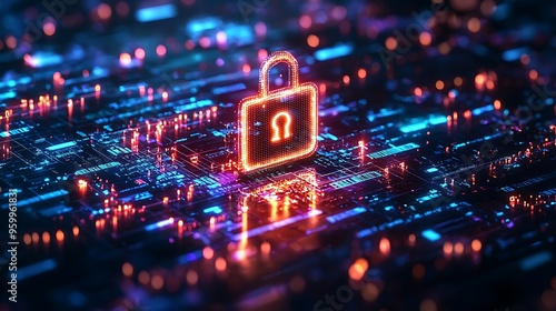 An abstract cyber security background with a digital lock embedded in a circuit board.