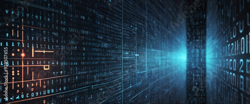 An abstract digital background with binary code and AI algorithms running in the background